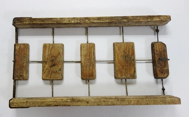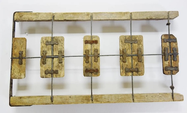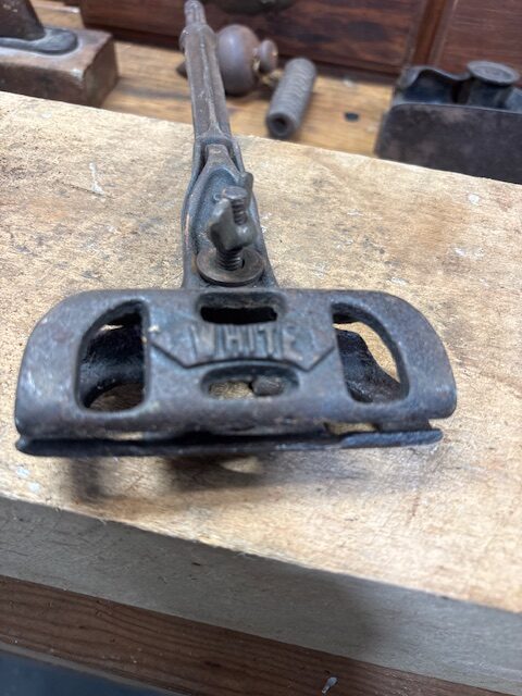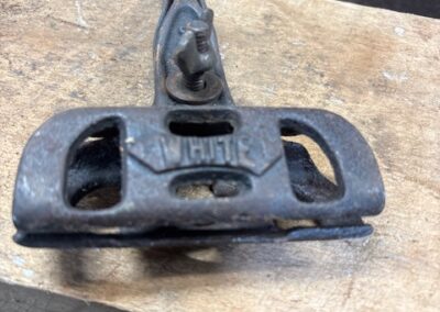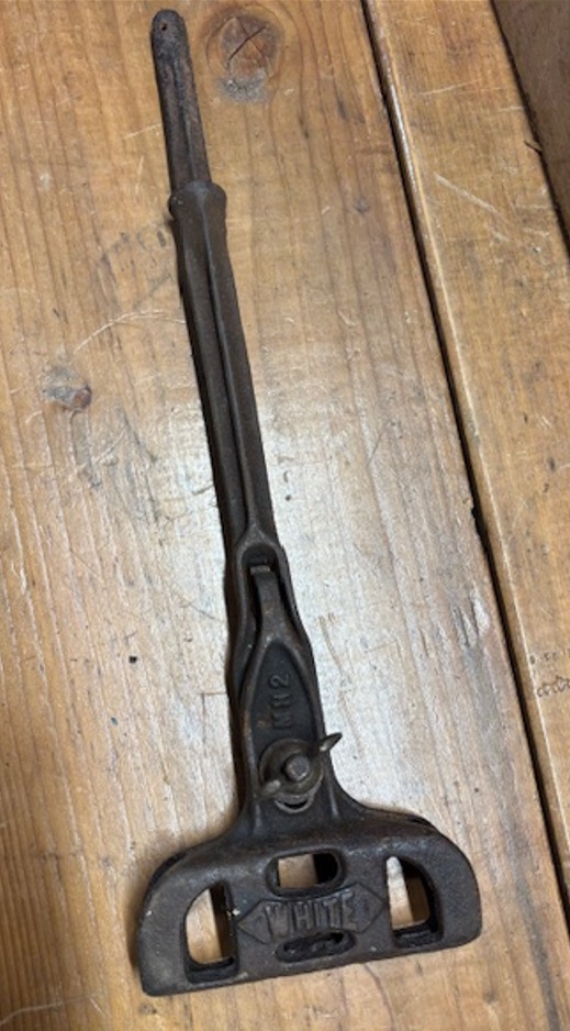 203-4 No answer yet for this item, it is 13″ long, and text on it says “White”. The most common guess for it is that it could be a clamp for holding a blade that was used as a scraper.