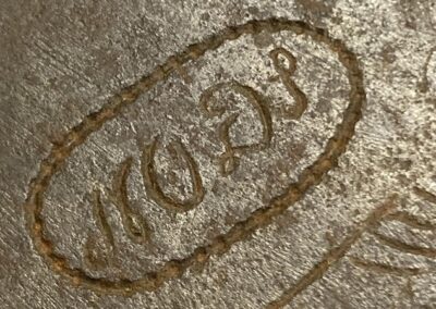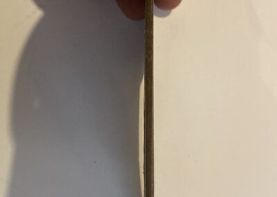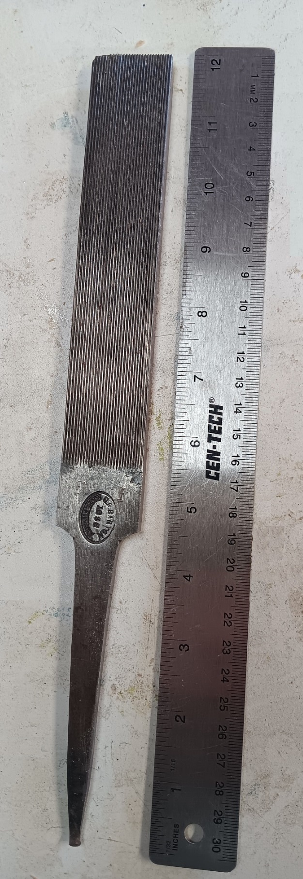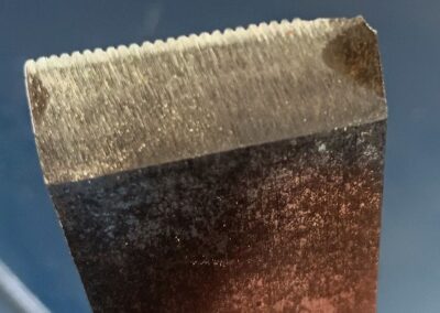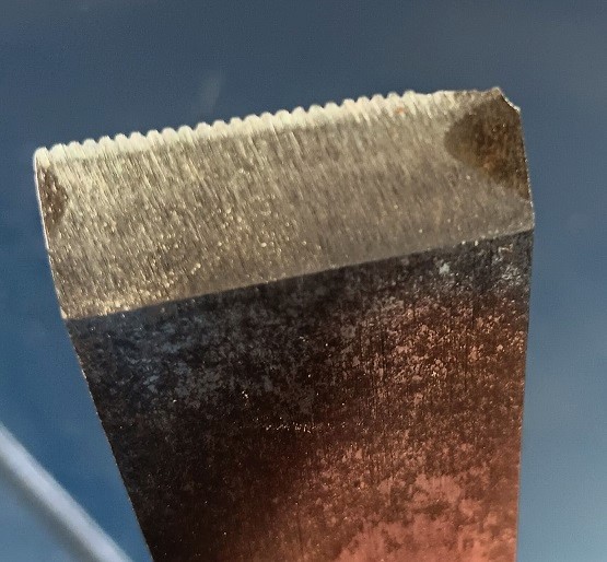 203-2 We have not been able to find a reference for this chisel shaped Barton tool, though it most closely resembles a Barton Tooth Plane Iron which was used in a toothing plane to scratch a series of fine, parallel grooves into wood surfaces. It is primarily used for roughening substrate wood before gluing veneer for better adhesion, and for leveling highly figured, curly, or cross-grained wood without tearing the fibers.