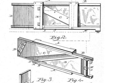 202-4 The mason who created this tool grew frustrated with wasting mortar while laying cinder blocks, as excess often dropped irretrievably into the hollow cores. To solve the problem, this device was designed to temporarily sit atop a block, mortar was then applied on top, next the tool was removed, and then another block set in place. The inventor crafted five or six similar versions, each with slight variations in design.