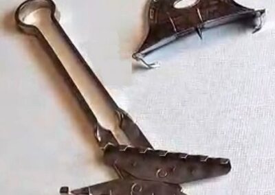 202-5 No verifiable answer yet for this bladed tool. As you can see, something appears to be broken off of the top. Suggestions for it so far are that it could be a fleshing knife, or a decoration to be hung on a wall.