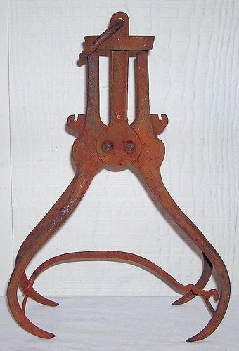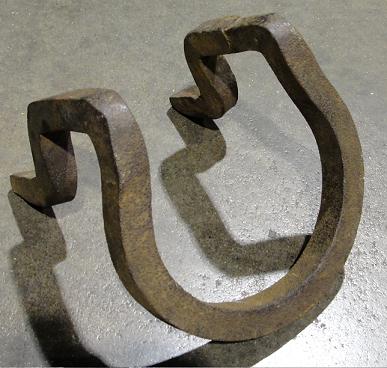156-2 This piece of hardware is used to make a ramp to help get logs up onto a wagon, these are used in a pair, each is placed on top of a wagon wheel, a log is then put into the U shape with the other end going on the ground. Horses on the other side of the wagon can then pull the log up the ramp and into the bed of the wagon.