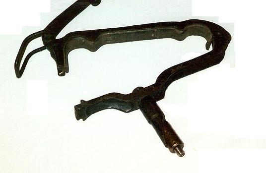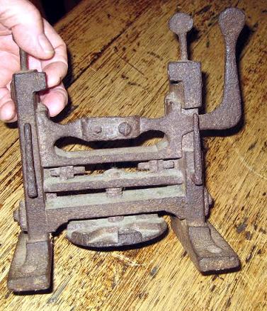 154-2. According to a M-WTCA member, “this is a Dixon leather splitter frame. Made by Dixon in England. It is missing the roller and blade. The blade is fixed and the bottom wheel adjusts a roller up and down to set the thickness of the finished leather split. This
