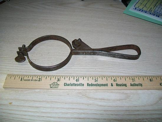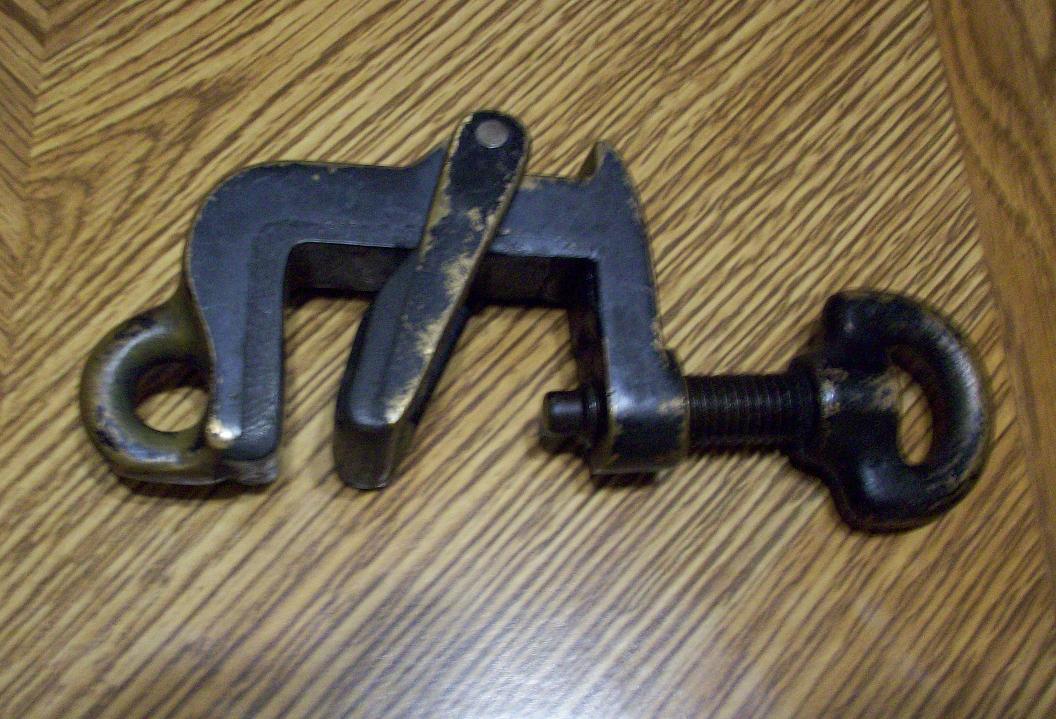156-3 6-1/2″ long, haven’t yet found a reference for this clamp, looks like it could have been used for lifting something or attached to the flange of a beam and then used to hang a light fixture etc.